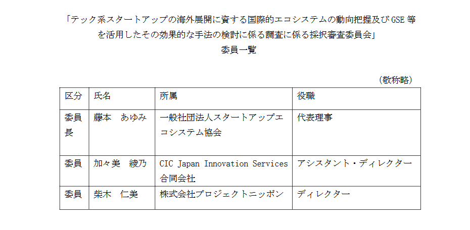 採択審査委員会の審査員を務めました php zerif_posted_on(); ?> NEDO公募事業「テック系スタートアップの海外展開に資する国際的エコシステムの動向把握及び GSE 等を活用したその効果的な手法の検討に係る調査に係る採択審査委員会」において、弊社ディレクタの柴木仁美が採択審査委員会の審査員を務めました。